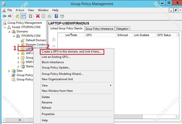 - Tiếp theo bạn Mở Group Policy Management lên bạn chọn OU mình cần triển khai và click chuột phải lên OU đó chọn Create a GPO in this domain, and Link it here...