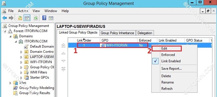 - Tại Policy bạn đã tạo ra, ở đây tôi đặt là LAPTOP-USEWIFIRADIUS, bạn click chuột phải lên Policy nầy chọn Edit.