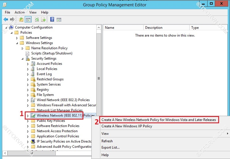 - Policies> Windows Settings> Security Settings> Wireless Network (IEE 802.11) Policies.