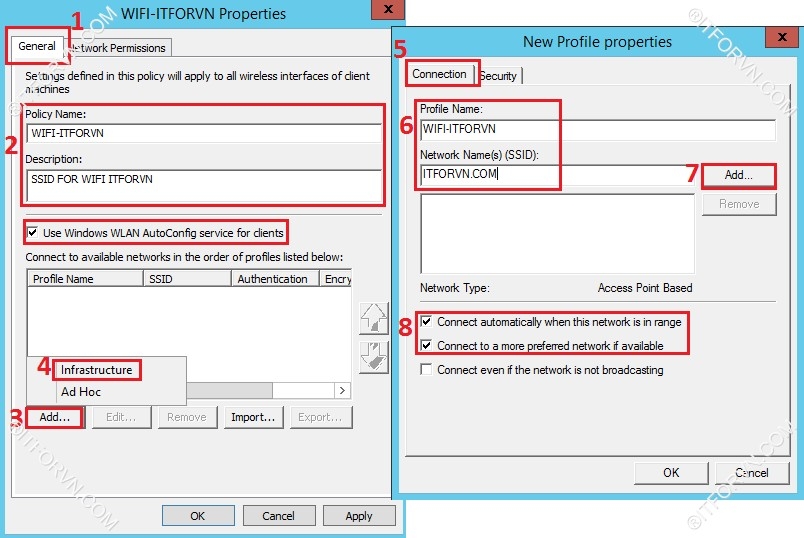 - Bên dưới Connect to available networks in the order of profiles listed bellow: bạn chọn Add > Infratructure