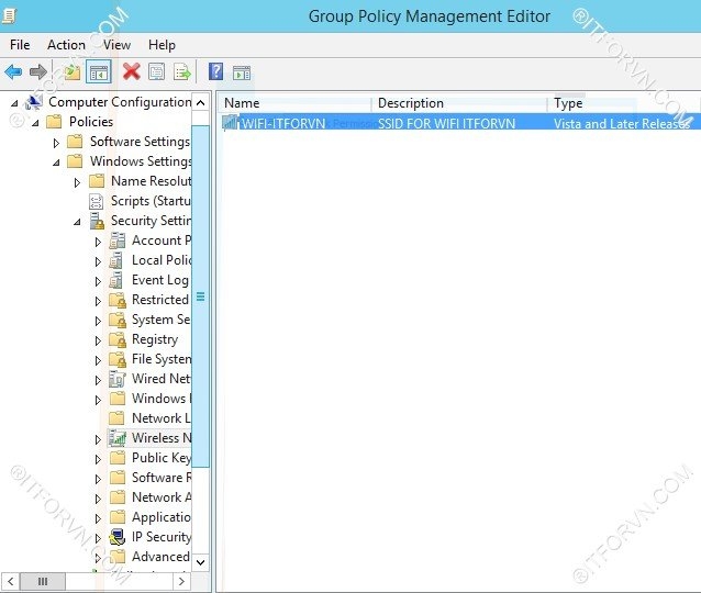 - Sau khi xong bạn thấy policy đã tạo nằm bên trong Policies> Windows Settings> Security Settings> Wireless Network (IEE 802.11) Policies.