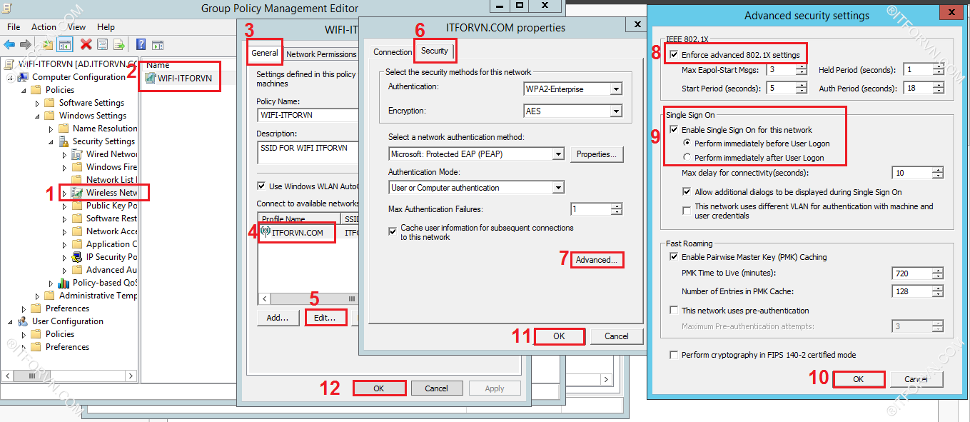 Trường hợp bạn muốn user login vào Laptop là tự động join vào wifi luôn thì bạn cần enable IEE 802.1X và Single Sign On như hình bên dưới: