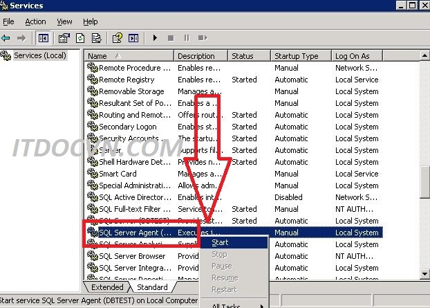 - Bạn vào start > run > gõ lệnh services.mscsau đó chọn dịch vụ SQL Server Agent rồi sau đó click chuột phải chọn start