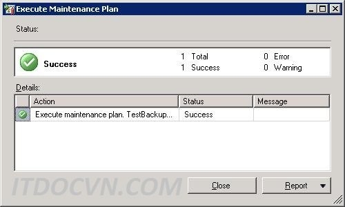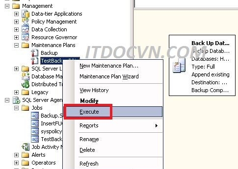 - Sau khi hoàn tất thì đúng schedules backup sẽ chạy, tuy nhiên ở đây để test ngay task backup set có work hay không nên ta click chuột phải chọn Mantenance Plan vừa tạo rồi chọn Execute để kiểm chứng.