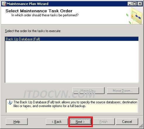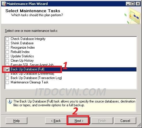 - Hộp thoại Select Maintenance Task xuất hiện bạn chọn loại hình backup mà bạn cần. ở đây mình backup full nên mình chọn Backup Full Database (Full). Và chọn Next để tiếp tục.