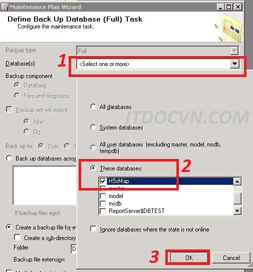 - Database(s): bạc click vào mũi tên xổ chọn database mà bạn cần backup, nếu bạn backup tất cả các database trong instance thì bạn chọn All database. và bạn chọn ok.