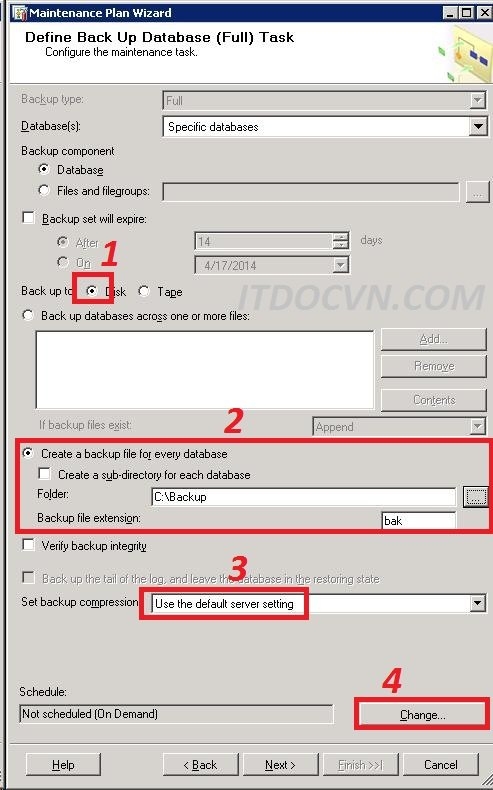 - Sau đó click Change để setup thời gian biểu backup