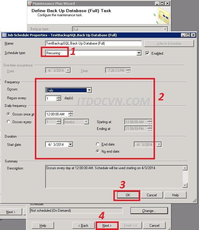 - Job Schedule Properties bạn chọn thời gian biểu backup mà bạn muốn ở đây mình làm daily backup nên Schedule type mình chọn Recurringvà Occurs mình chọn Daily nếu bạn backup Monthly hoặc Yearly thì ở Occurs bạn chọn đúng loại bạn muốn. Sau đó bạn Nhấn ok