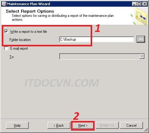 - Hộp thoại Select Report Options xuất hiện click Write a report to text file và chọn chỗ để lưu log file của quá trình backup và chọn Next để tiếp tục.
