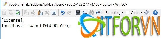 root@localhost:/opt/unetlab/addons/iol/bin# python CiscoKeyGen.py ********************************************************************* Cisco IOU License Generator - Kal 2011, python port of 2006 C version hostid=007f0100, hostname=localhost, ioukey=7f04c9 ********************************************************************* Create the license file $HOME/.iourc with this command: echo -e '[license]\nlocalhost = aabcf39fd385b1eb;' | tee $HOME/.iourc The command adds the following text to $HOME/.iourc: [license] localhost = aabcf39fd385b1eb; ********************************************************************* Disable the phone home feature with this command: grep -q -F '127.0.0.1 xml.cisco.com' /etc/hosts || echo '127.0.0.1 xml.cisco.com' | sudo tee -a /etc/hosts The command adds the following text to /etc/hosts: 127.0.0.1 xml.cisco.com ********************************************************************* root@localhost:/opt/unetlab/addons/iol/bin#