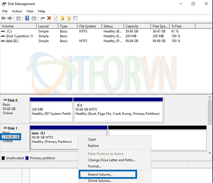Mở disk management trong Windows Server và chọn disk. Nhấp chuột phải vào nó và chọn Extend Volume.