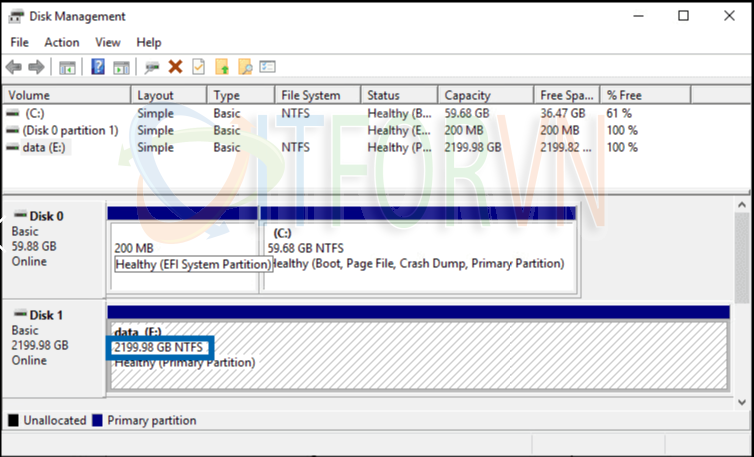 Đĩa của bạn sẽ thay đổi kích thước volume và hiển thị cho bạn dung lượng mới, như trên màn hình bên dưới.