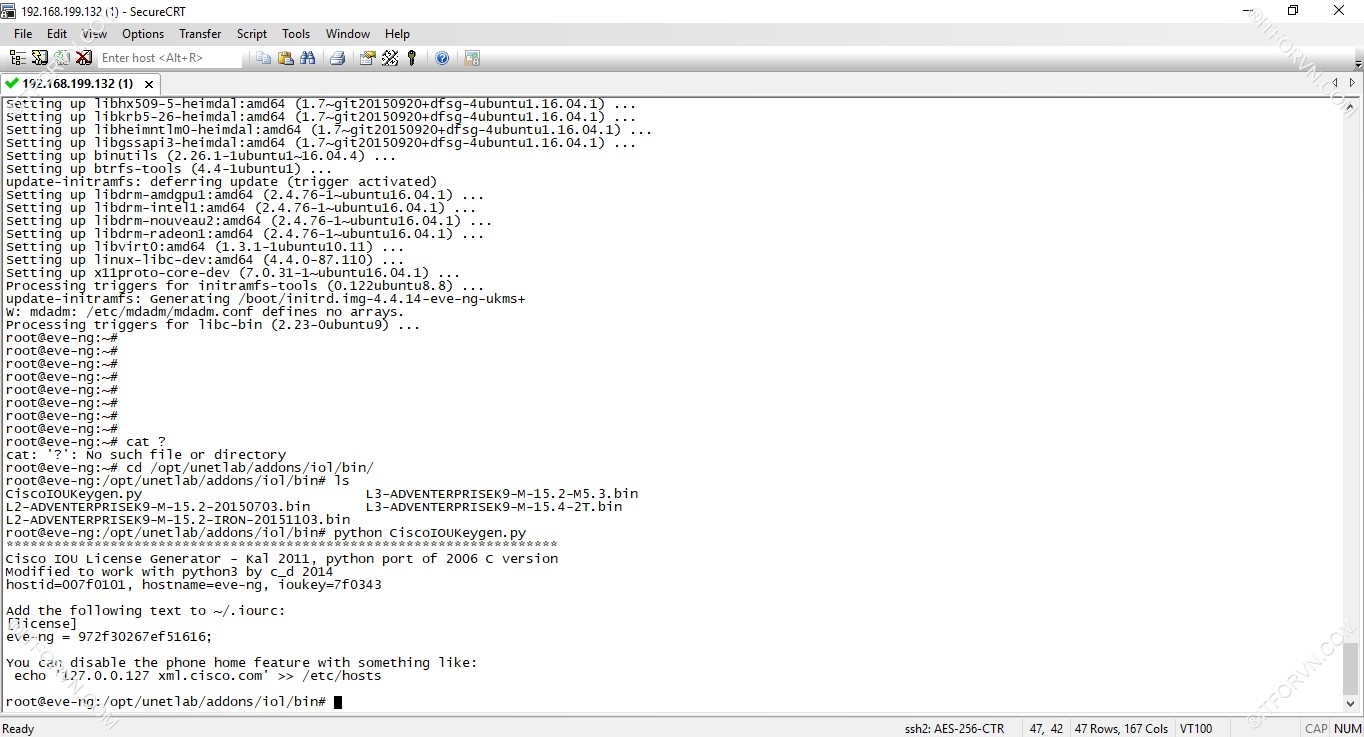 root@eve-ng:~# cd /opt/unetlab/addons/iol/bin/ //truy cập vào thư mục binroot@eve-ng:/opt/unetlab/addons/iol/bin# ls //xem tất cả image addedCiscoIOUKeygen.py L3-ADVENTERPRISEK9-M-15.2-M5.3.binL2-ADVENTERPRISEK9-M-15.2-20150703.bin L3-ADVENTERPRISEK9-M-15.4-2T.binL2-ADVENTERPRISEK9-M-15.2-IRON-20151103.binroot@eve-ng:/opt/unetlab/addons/iol/bin# python CiscoIOUKeygen.py //active license