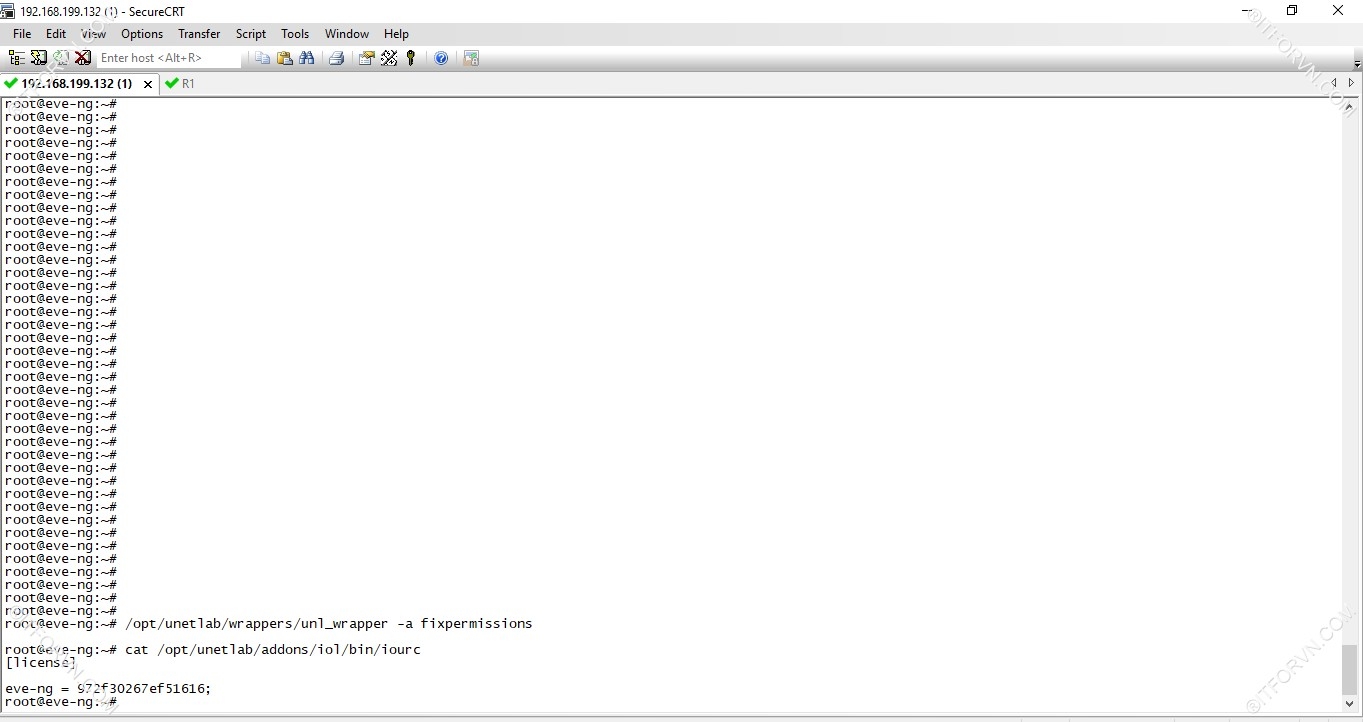 root@eve-ng:~# /opt/unetlab/wrappers/unl_wrapper -a fixpermissions root@eve-ng:~# cat /opt/unetlab/addons/iol/bin/iourc [license] eve-ng = 972f30267ef51616; (Các bạn lưu ý "license code" có thể khác nhau từng version, các bạn cứ chạy lệnh license xong lấy code các bạn thu được đưa vào file iource nhé).
