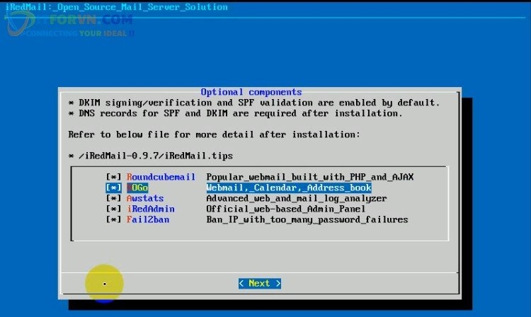 - Sau khi chọn xong các component ta chọn Next để tiếp tục quá trình cài đặt iRedMail server