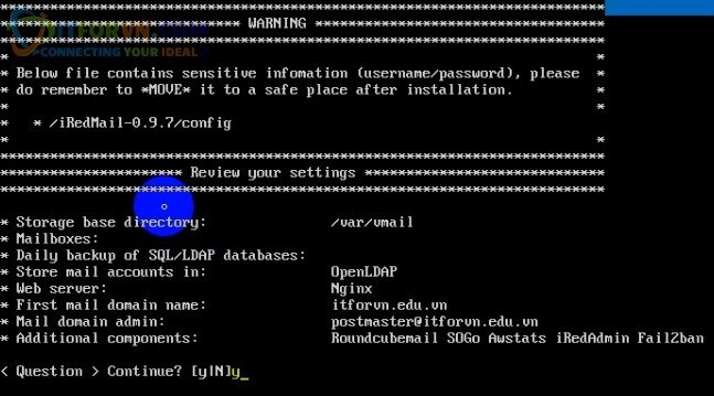 - Tới bước nầy thì trình cài iRedMail summary lại cho chúng ta 1 lần nữa và yêu cầu chúng ta confirm