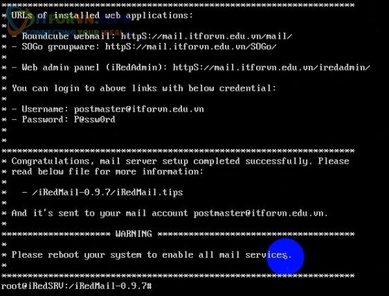 Step 13: Sau khi Cài đặt xong trình cài đặt iRedMail Server báo chúng ta là việc cài đặt đã hoàn tất và nó cho chúng ta thông tin để login vào hệ thống mail server của mình: