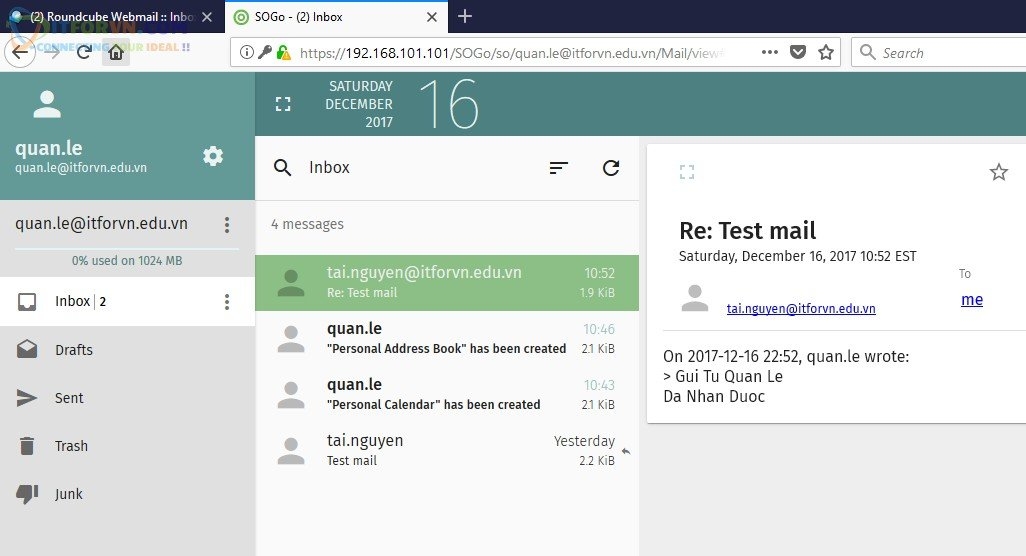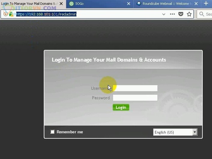 Tôi sẽ đăng nhập vào 2 trình đọc mail trên web của iredmail server là SOGo và roundcube để test việc gửi mail qua lại giữa 2 users.
