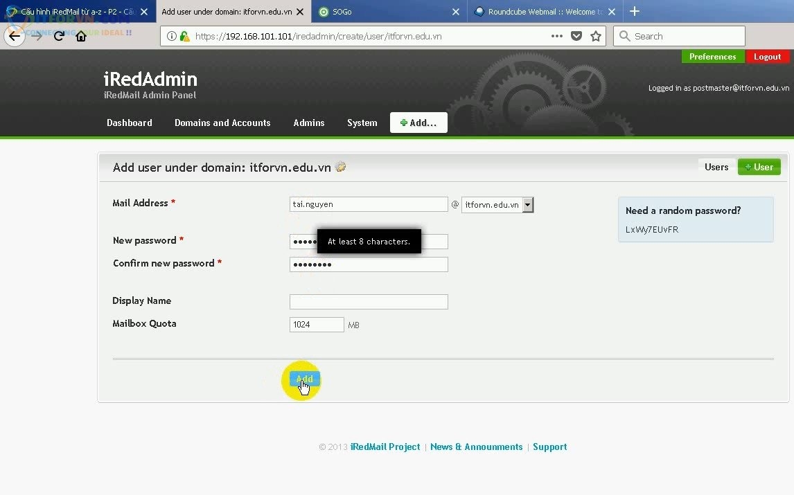 Tạo user mailbox cho iredmail server: