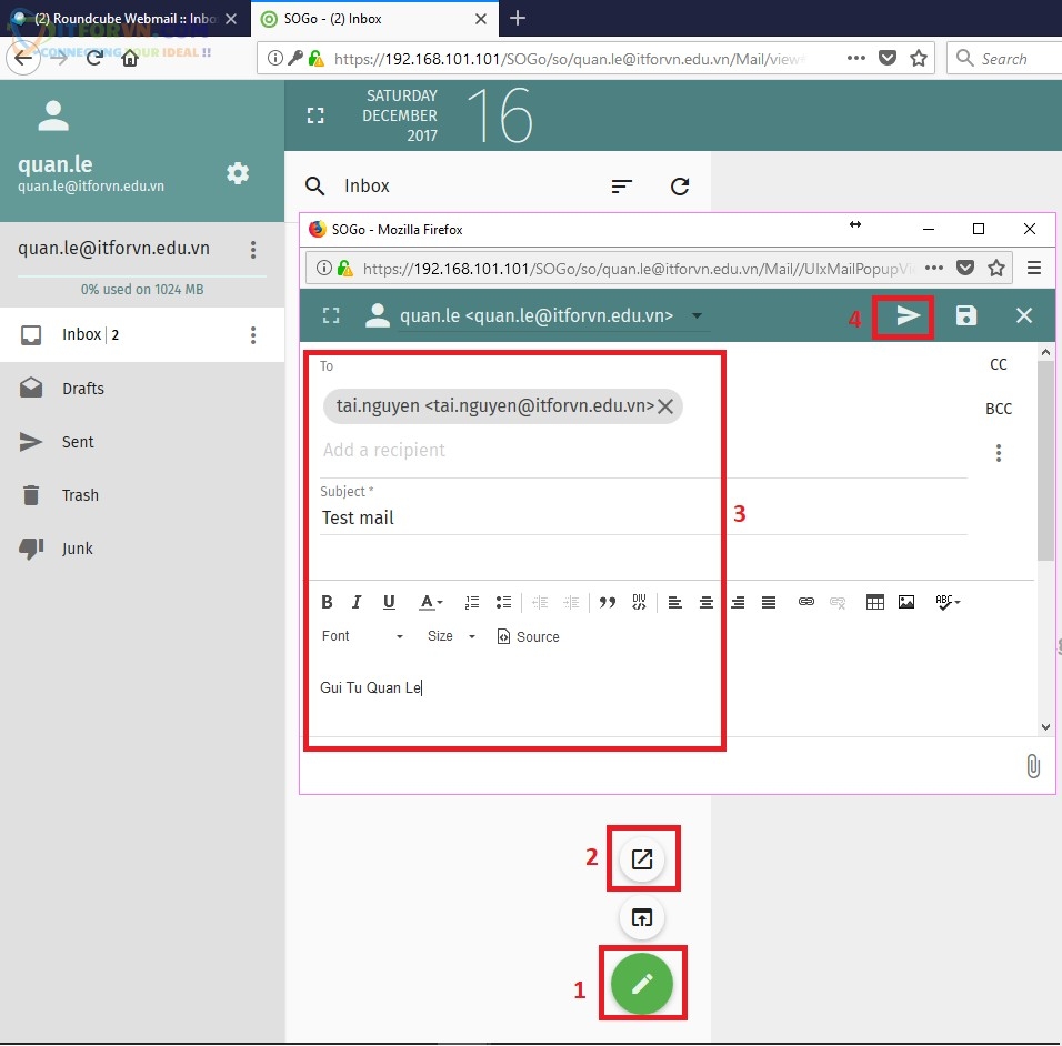 - Dùng SOGo ([email protected]) gửi mail qua cho [email protected] (dùng roundcube)