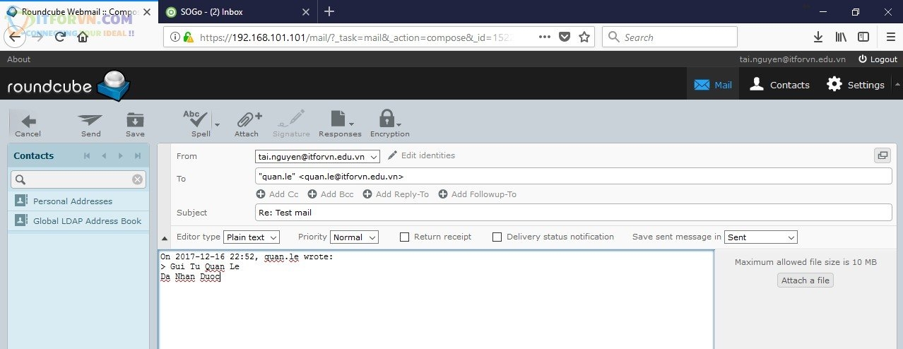 [email protected] đã nhận được email từ [email protected] (từ SOGo), và Reply lại.