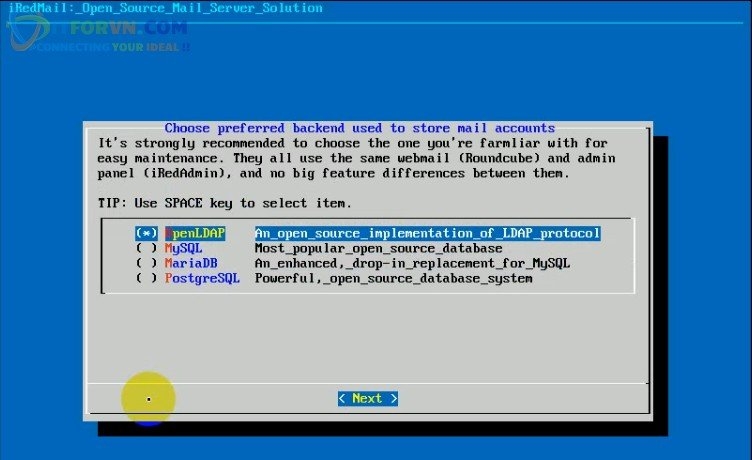 - Bạn chọn storage backend cho iRedMail
