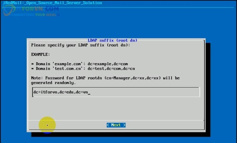 Trong bài lab nầy domain của mình là itforvn.edu.vn nên mình sẽ điền : dc=itforvn,dc=edu,dc=vn.