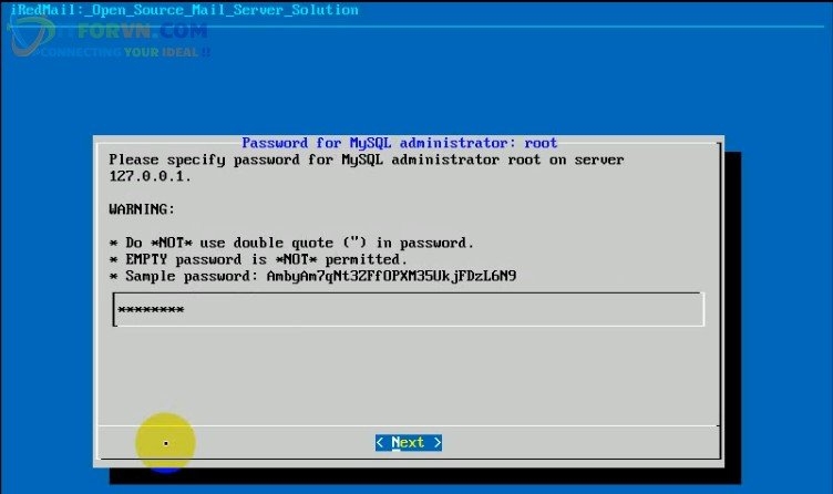 - Bạn gõ password của user root MYSQL và chọn Next để tiếp tục quá trình cài đặt iRedMail Server.