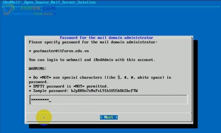 - Bạn gõ password của account postmaster. Đây là account dùng để quản trị iredmail server.