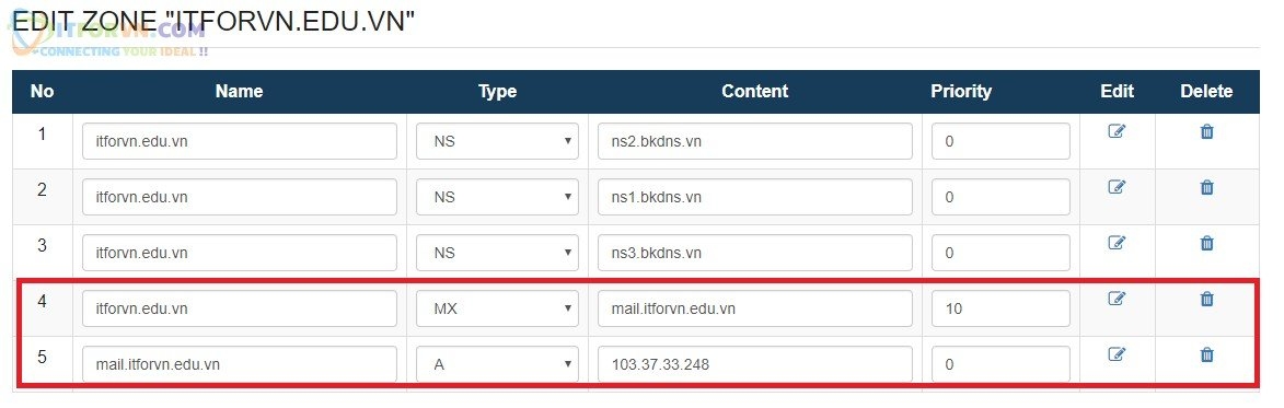 Ví dụ trong bài lab nầy public IP của mail server của mình là 103.37.33.248, và mình muốn A record là : mail.itforvn.edu.vn thì mình tạo như hình bên dưới, bao gồm 1 A record và một MX record.