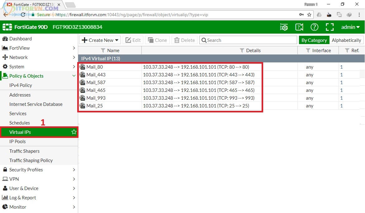 2. NAT Public IP ra Private IP của mailserver. Các port cần NAT là :