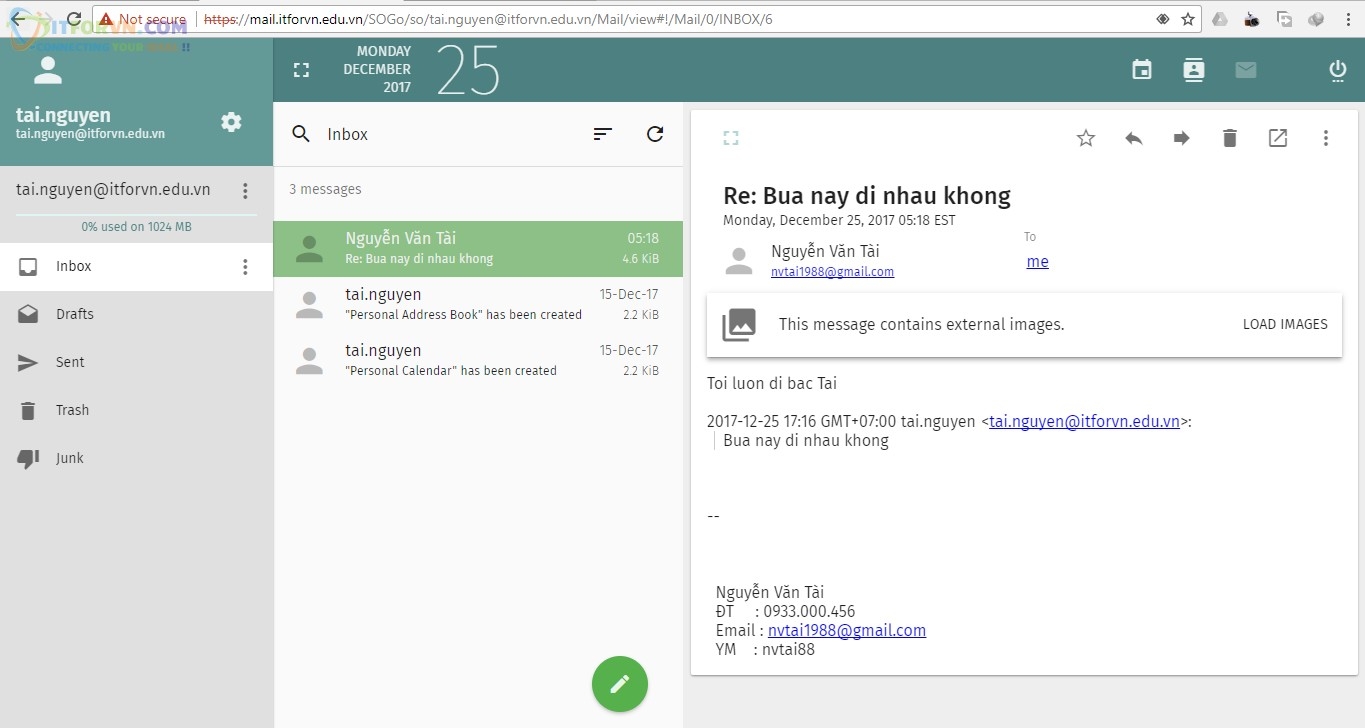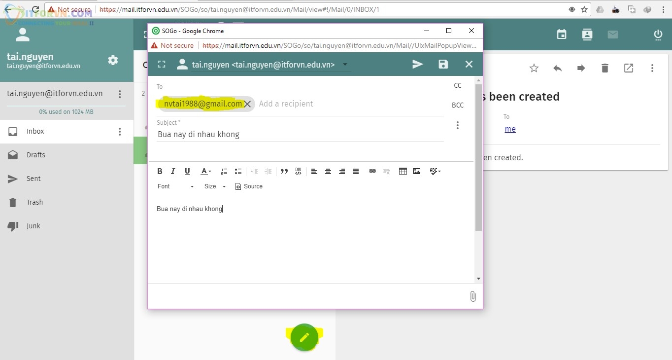 - Mình login vào web mail để thử gửi email ra 1 địa chỉ email ngoài internet.