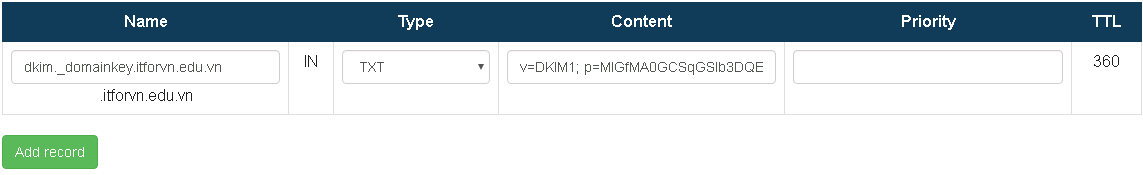 Sau đó mở DNS của bạn lên tạo record dkim Gõ dkim._domainkey trong name field. Paste đoạn vừa copy ở trên ra value, nhớ khúc đầu đuôi không có khoảng trắng.
