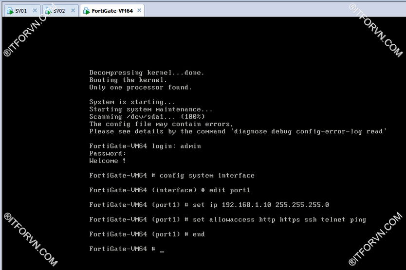 1.Set card mạng, đặt IP cho FortiVM