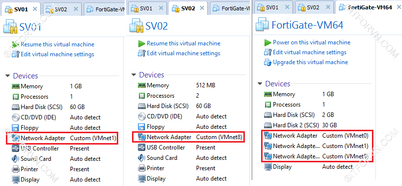 - VMnet1 gắn cho SV1,Port2 (FortiVM )