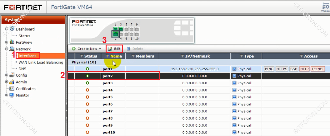 - Chọn Network> Interface> Chọn Port2