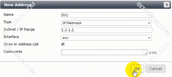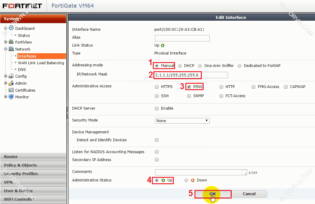 - IP/Network Mask: gõ IP cho port2 ( 1.1.1.1/255.255.255.0).