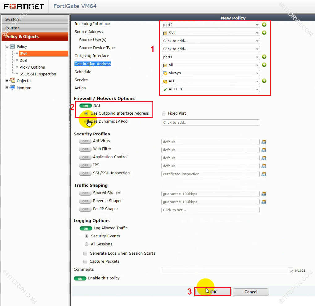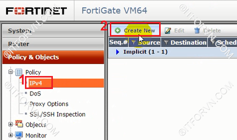 3.Tạo Policy trên firewall Fortinet ( FortiVM)