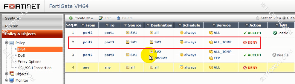 Incoming Interface : port2 Source Address: SV1 Outgoing Interface: port3 Destination Address: SV2 Service : ALL_ICMP FTP Action: Allow Và tắt NAT.