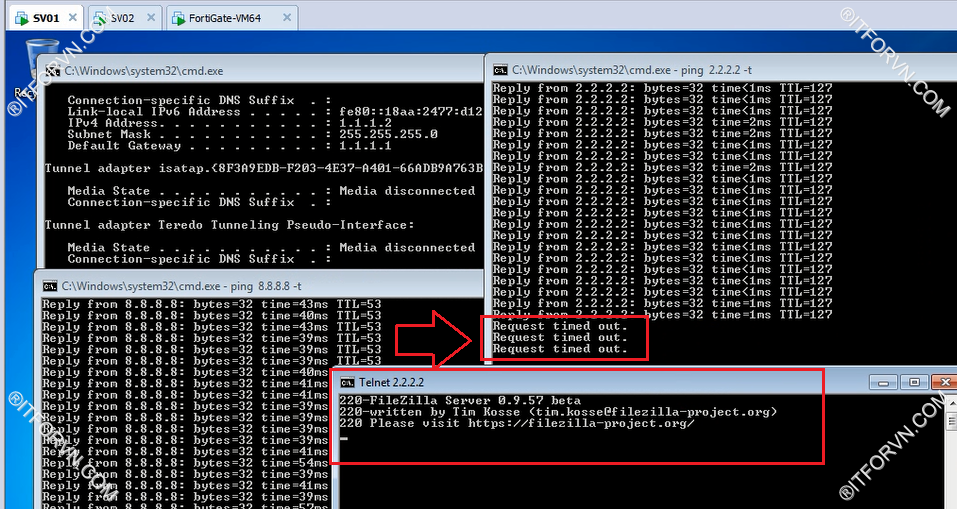 - Ta thấy SV1 không ping đến SV2 được, tuy nhiên telnet đến FTP trên SV2 từ SV1 vẫn được
