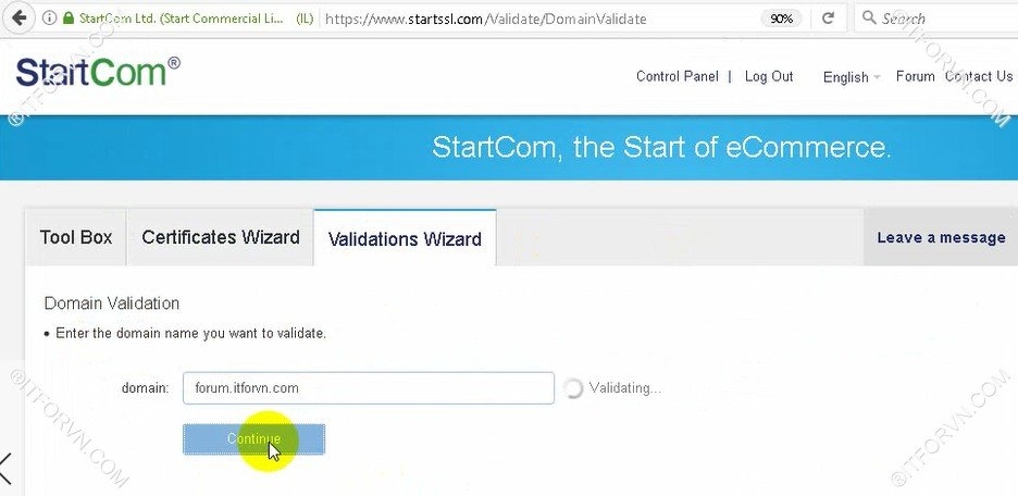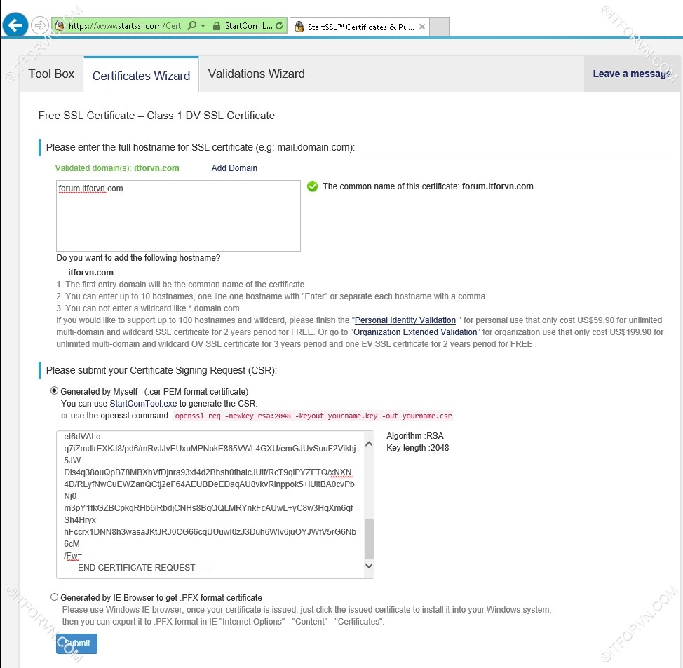 - Tại ô Validated domain chúng ta gõ địa chỉ website mà chúng ta sẽ cài ssl. trong bài lab nầy tôi sẽ đăng ký ssl cho forum.itforvn.vcode.ovh. - Tick vào Generated by Myself