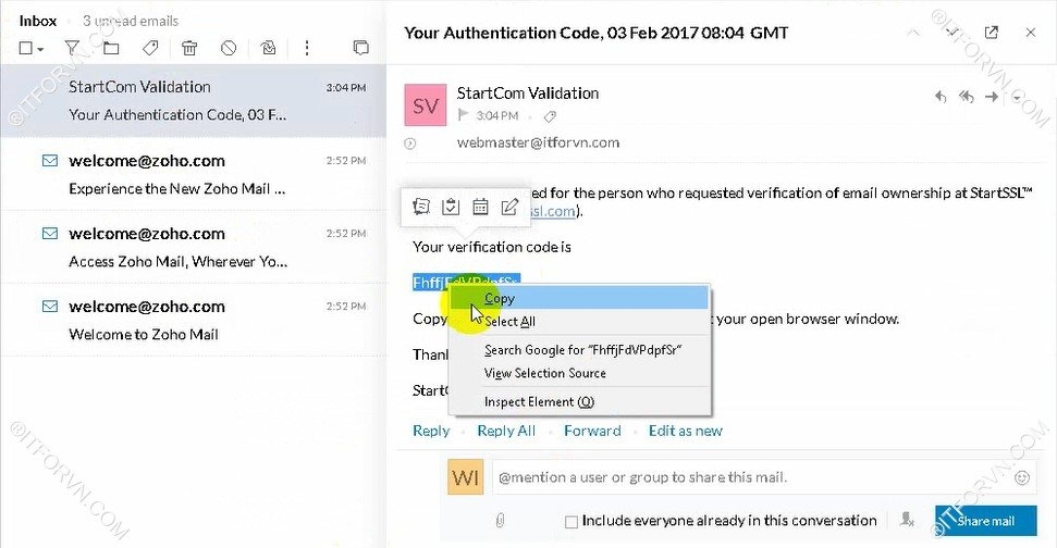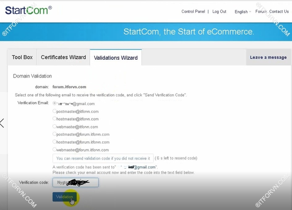-Bạn check mail và lấy chuổi xác thực paste vào ô Verification code sau đó bấm vào nút Validation