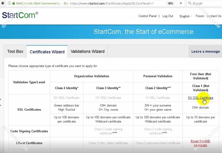 - Ta chọn tab Certifcates Wizard và click chọn DV SSL Certificate.