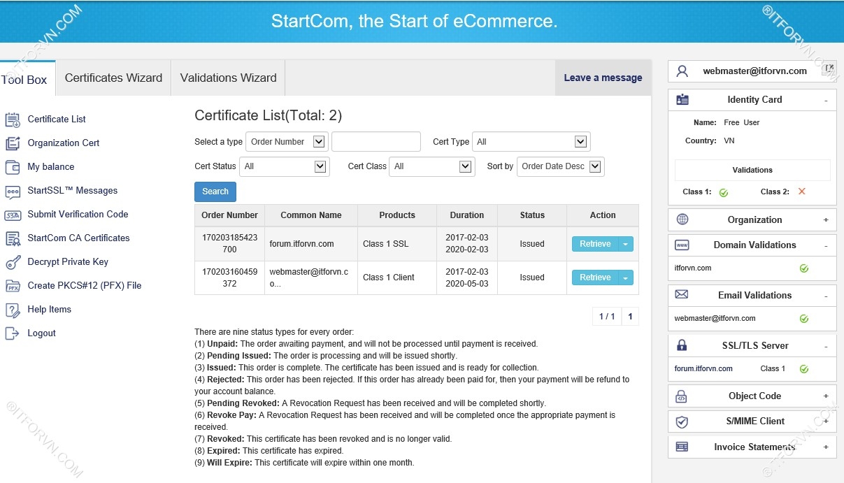 Trong bài lab trước bạn Hiếu có hướng dẫn cách đăng ký và cài đặt SSL Let's Encrypt cho web server (Nginx). Hôm nay mình sẽ hướng đẫn các bạn đăng ký 1 SSL khác. Trong tâm bài lab hôm nay là hướng dẫn các bạn đăng ký SSL của StartSSL 1 Chút thông tin về startssl đây là nhà cung cấp SSL được khá nhiều anh em lựa chọn, vì nó cho free lên tới 3 năm cho 1 DV (Domain Validated). Nghe thì quá hấp dẫn luôn. Tuy free như có 1 điều công nhận là hãng nầy support khá nhanh và khá tốt, điều đó mình và nhiều anh em khác rất hài lòng, về điểm nầy thì so với Let's Encrypt có vẽ em nầy khá khá hơn xíu. StartSSL ngày trước là của Israel. Tuy nhiên dưới sự banh trướng của nhân dân tệ anh ấy đã về team của anh Tập Cận Bình :( . Mà từ ngày anh ấy về team anh Bình có nhiều điều thay đổi chóng mặt, tuy nhiên về cơ bản thì vẫn còn dùng được. Không quảng cáo nhiều nữa, mình sẽ đi vào tut luôn