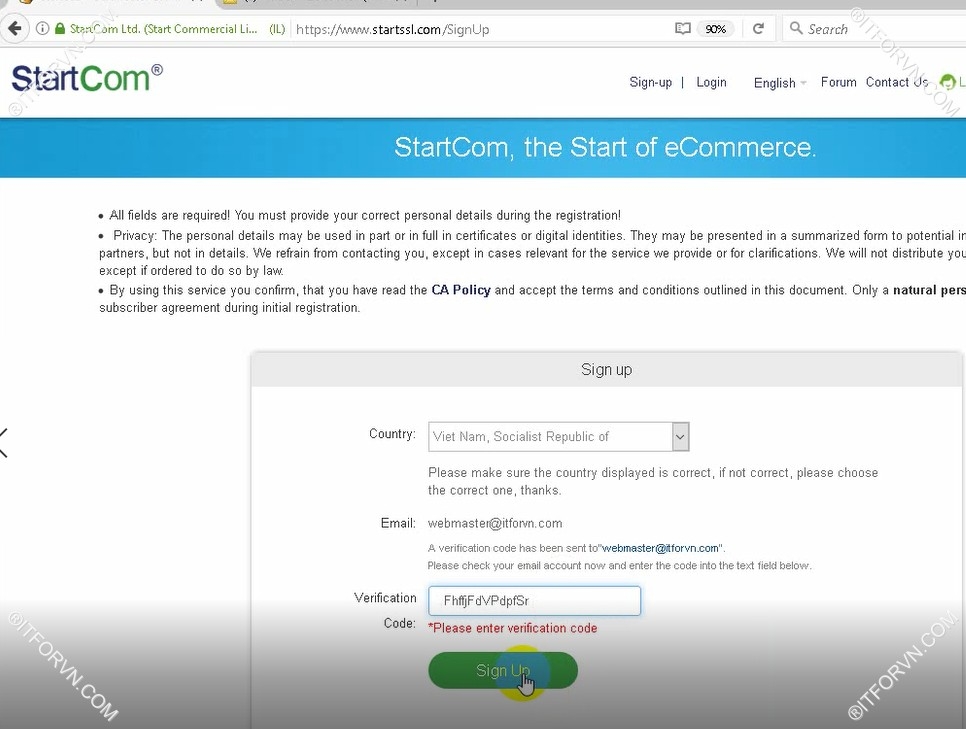 - Sau đó paste vào hộp thoại Verification và bấm Sign up