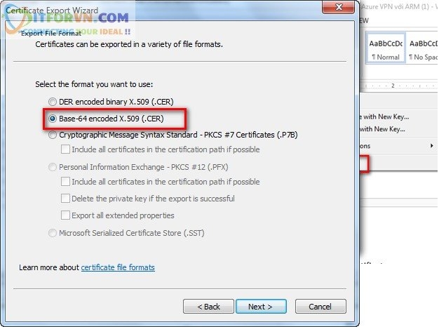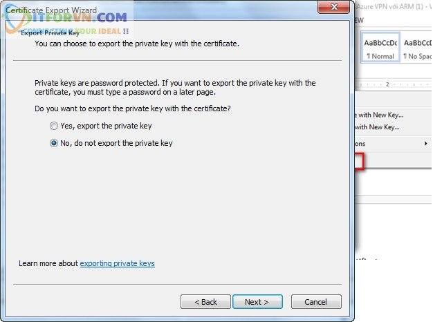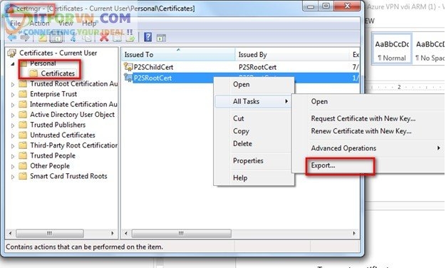 Sau khi Certificate đã tạo thành công. Export public key ra. Key này sẽ dùng để Upload lên Azure VPN