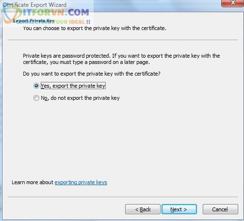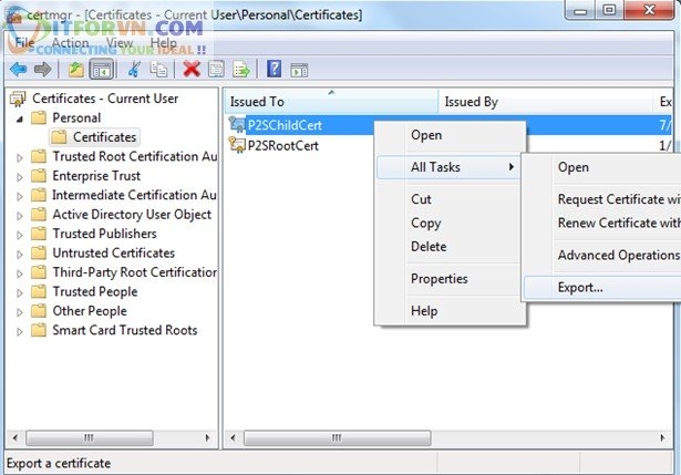 Tương tự như export public key root certificate. Vào certmgr, Personal/Certificate