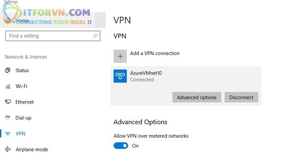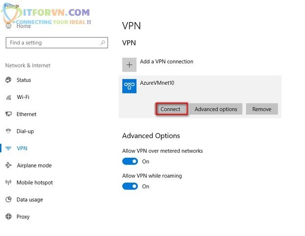 Vào mục VPN trong Network Setting, chọn AzureVPN sau đó nhấn Connect