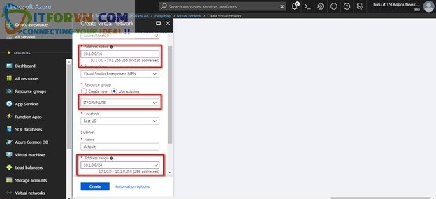 Virtual network : chọn vào Azure Virtual Network đã tạo trước đó, đang dùng cho những VM trong Azure.