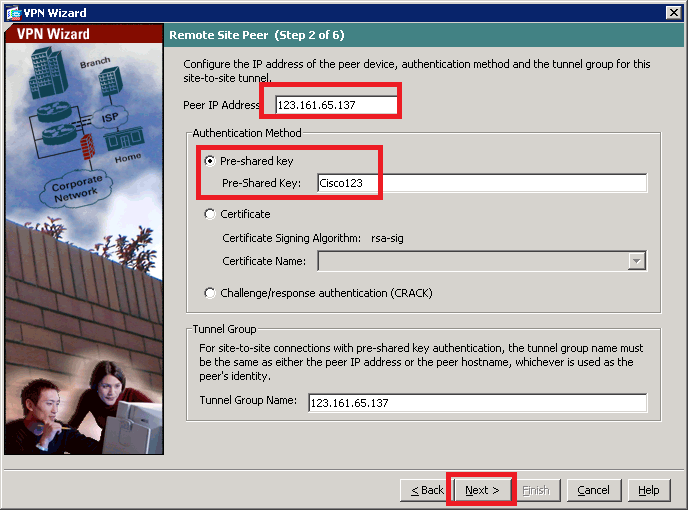 Pre-shared key: gõ Cisco123(giống như Pre-shared key ở router cisco 2811 site A) và nhấn Next.